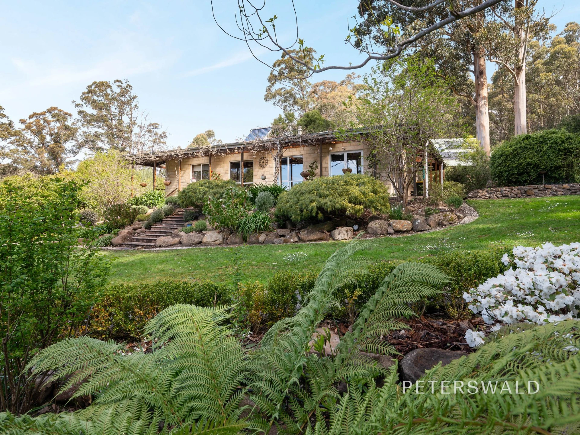 Set adjacent to the beautiful bushland of Wellington Park, this simply delightful residence is ensconced by beautifully manicured gardens, with soothing views over the surrounding bushland directly out to the Derwent river. Rolling lawns, hand crafted stone retaining walls and well established garden beds alive with springtime colour have created a very special setting indeed, ideal for young and older families alike to enjoy in privacy and seclusion.