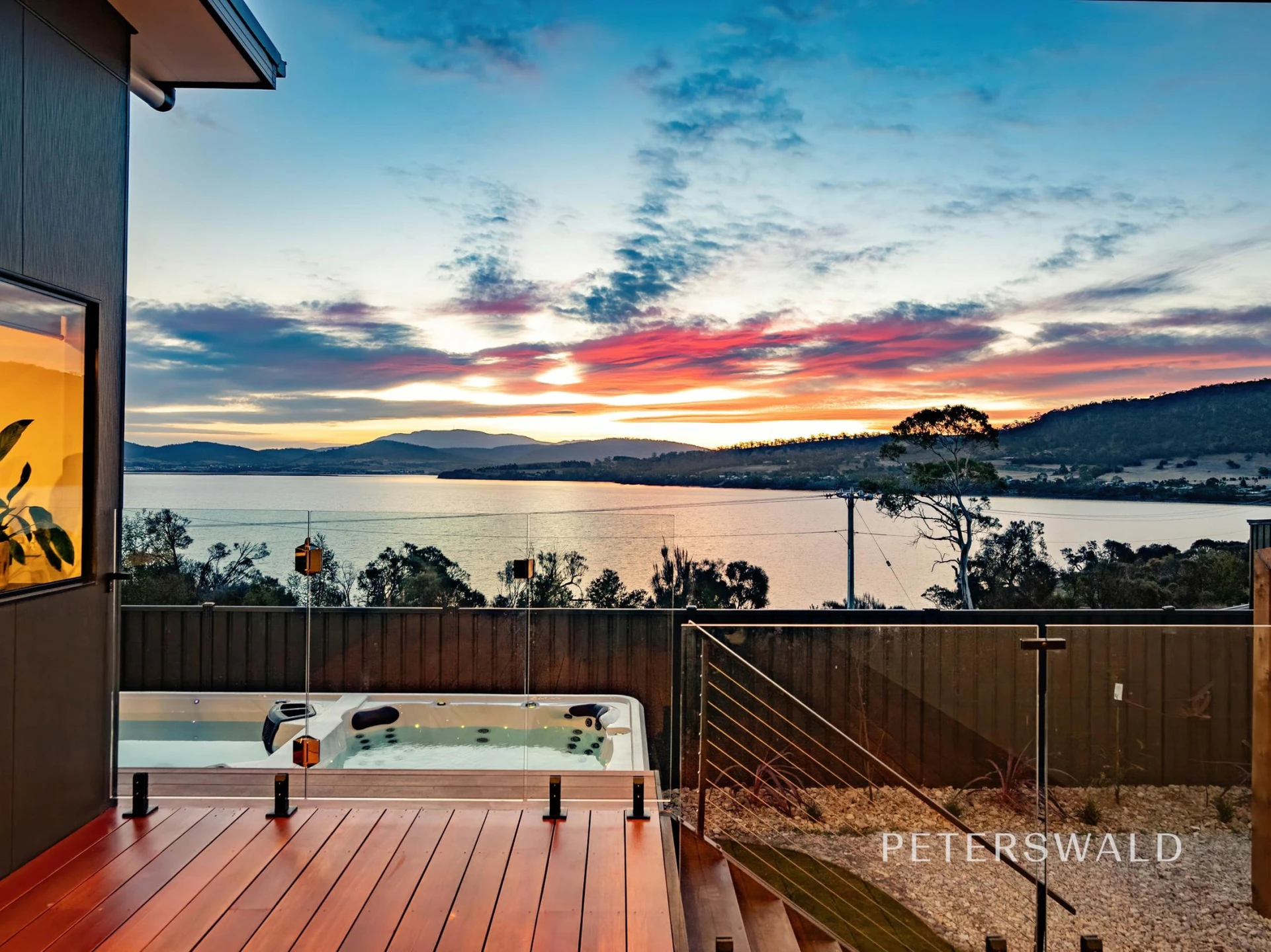 The outdoor spaces elevate the property into true resort-style territory. A covered alfresco entertaining zone with a motorised vergola roof allows year-round gatherings in comfort and style. Beyond, the landscaped grounds reveal a dual spa and swim spa positioned to capture sweeping water and mountain views, while a dedicated fire pit area provides the perfect setting for relaxed evenings under open skies.